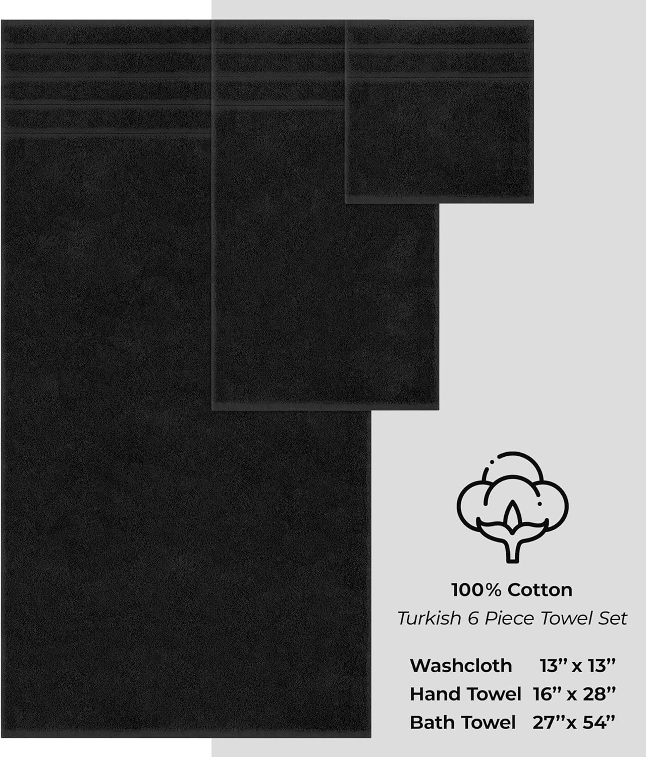American Soft Linen Luxury 6 Piece Towel Set, 2 Bath Towels 2 Hand Towel 2 Washcloths, 600 GSM 100% Cotton Turkish Towels for Bathroom, Black Towel Sets
