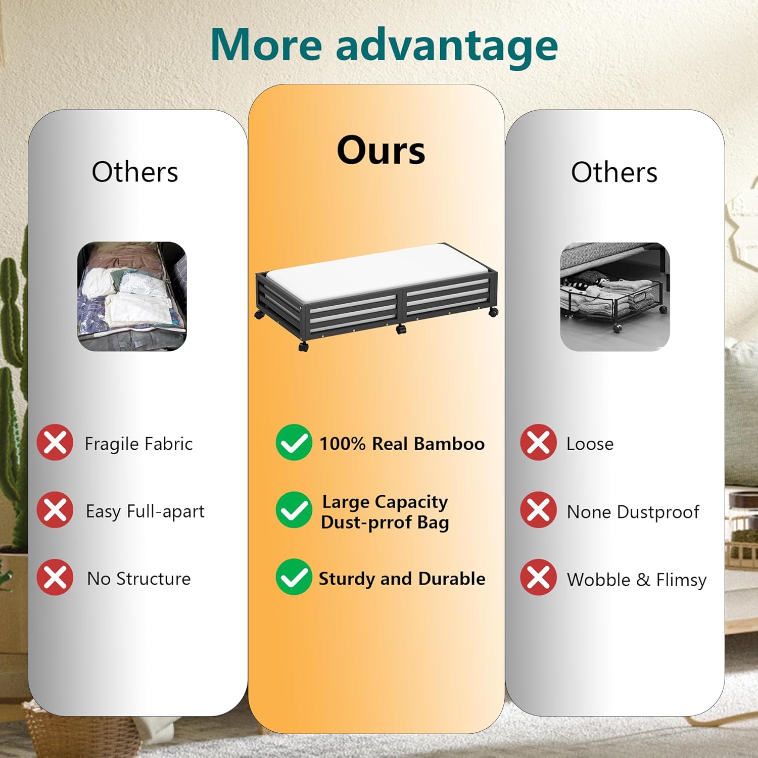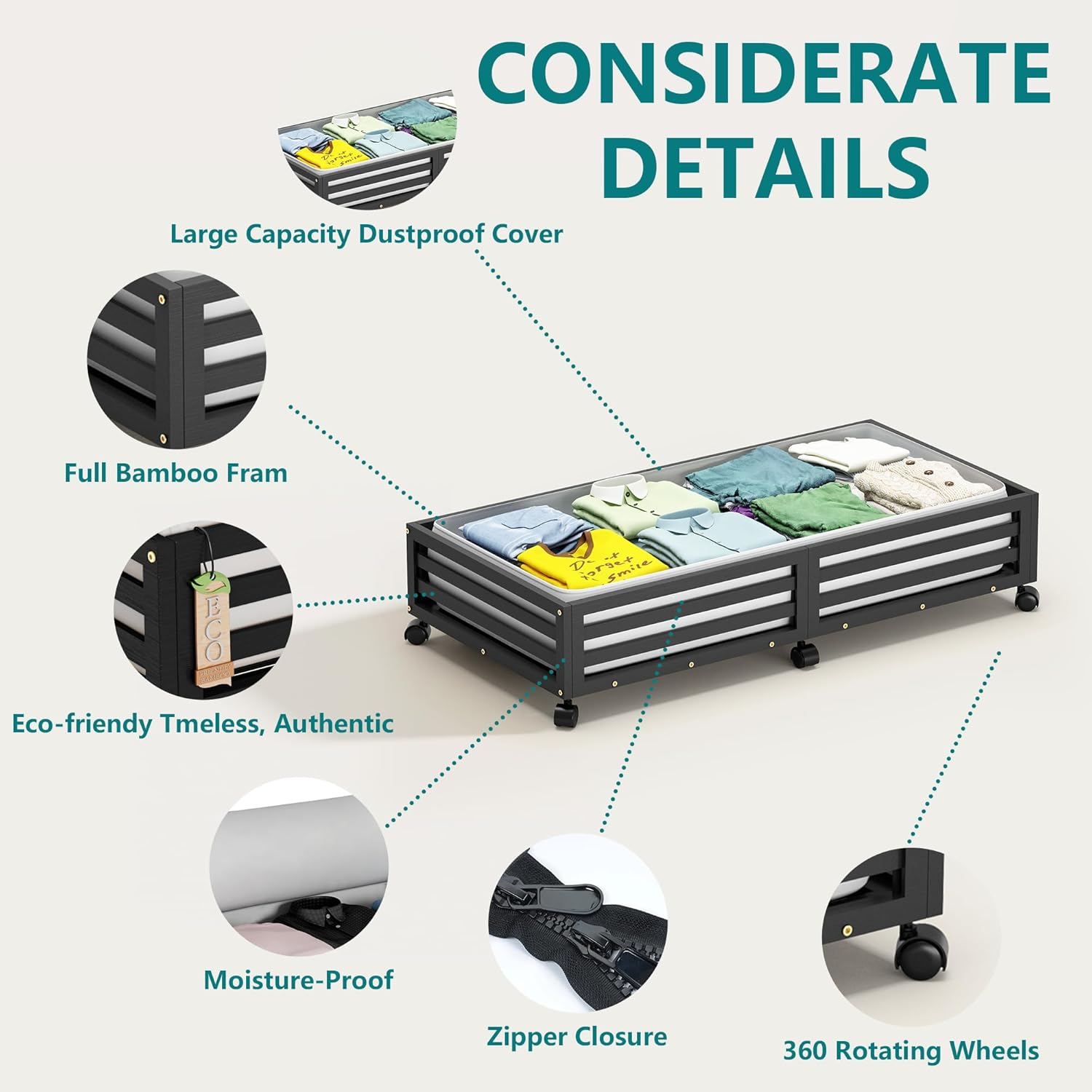 Bamboo Under Bed Storage Containers- Underbed Organizer with Wheels with Large Capacity Dust Bag,Sturdy Wood Rolling Under Bed Shoe Storage Organizer 2 Packs (Black, 2 Packs (33.07"×16.54"))