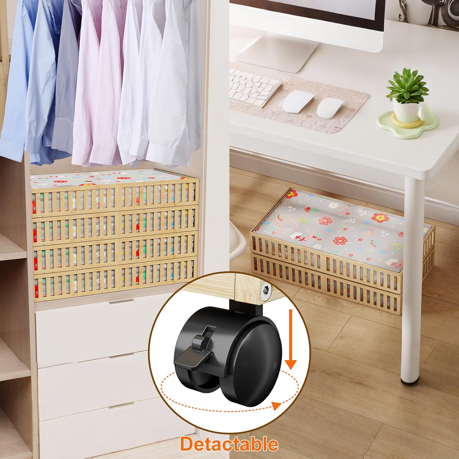 Bamboo Under Bed Storage Containers with Wheels, 40L UnderBed Drawers with Dust Bag, Breathable Under Bed Shoe Storage, Rolling UnderBed Clothes Storage, 2Pack