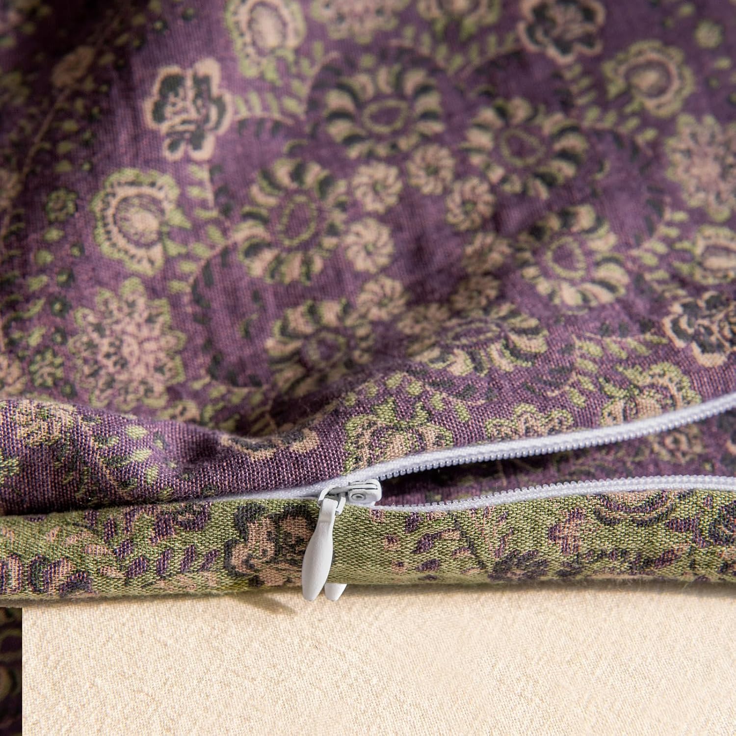 VM VOUGEMARKET Purple Green Duvet Cover Queen,3 Pieces Retro Boho Medallion Jacquard Flower Bedding Set,Linen Cotton Yarn-Dyed Textured Duvet Cover with Zipper Closure