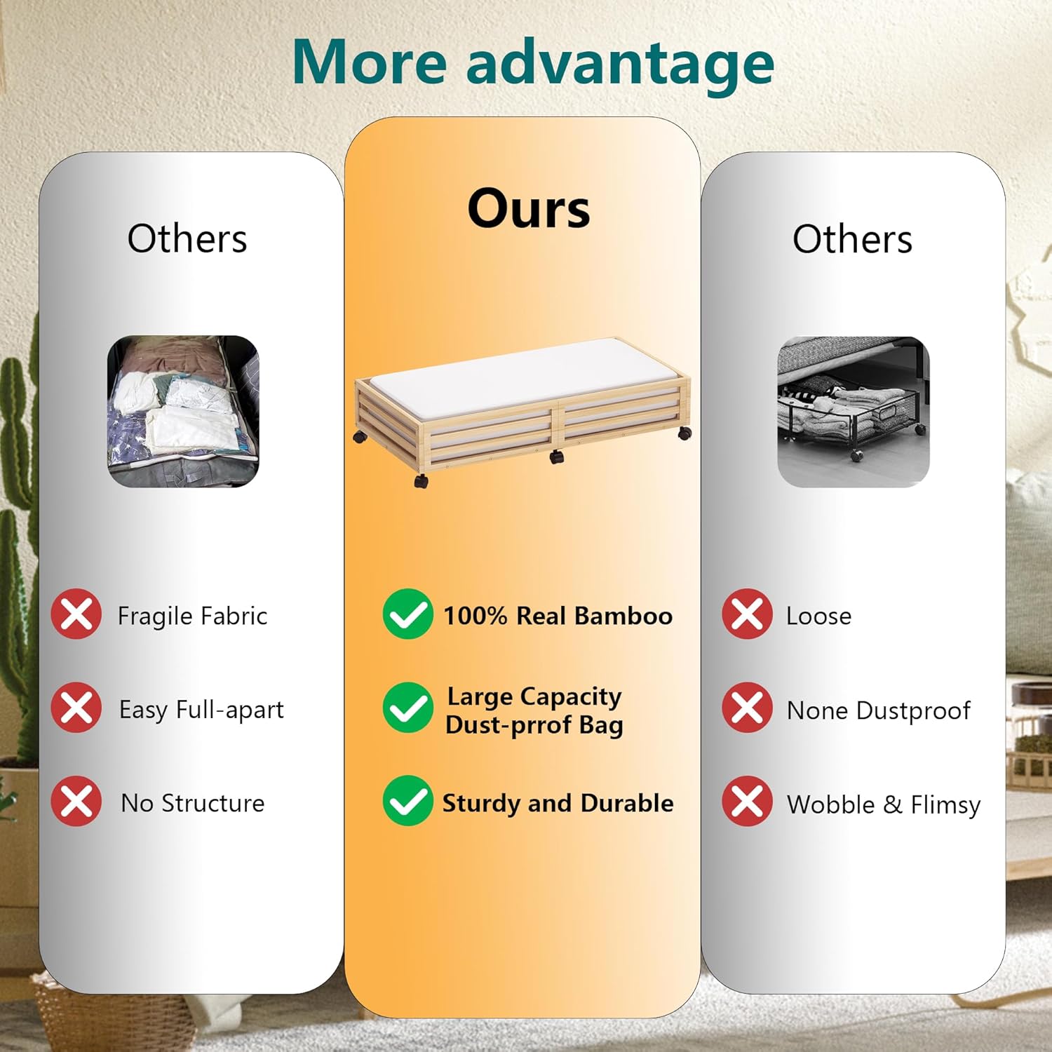 Bamboo Under Bed Storage Containers- Underbed Organizer with Wheels with Large Capacity Dust Bag,Sturdy Wood Rolling Under Bed Shoe Storage Organizer Drawer for Shoes Toys Closet Home and Bathroom